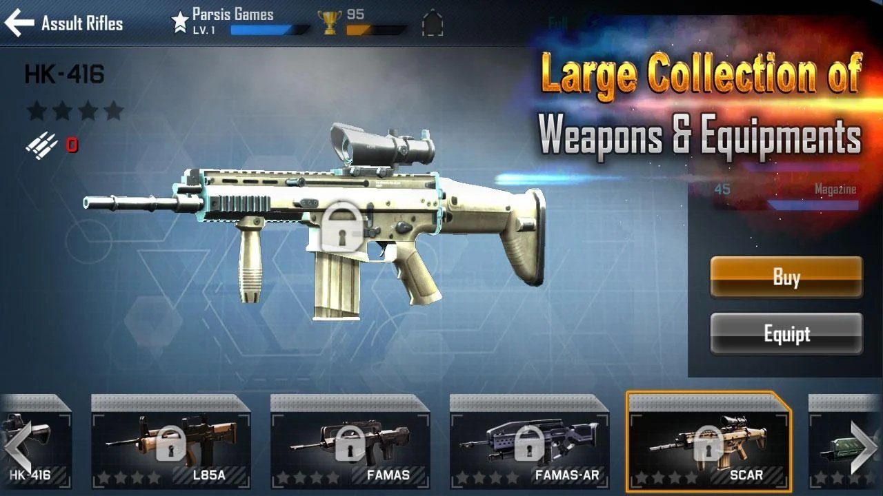 1. 提供丰富多样的武器选择,包括步枪、机枪、狙击枪等多种枪械,以及手榴弹、烟雾弹等战术辅助装备,玩家可根据不同任务灵活配置组合。